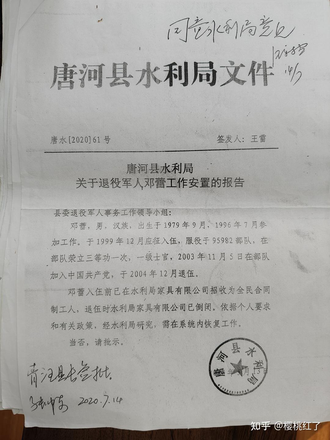 我的儿子邓蕾,1996年7月经唐河县劳动局批准,被水利局下属的建材家俱有限公司招收为全民合同制工人,随即被分配到虎山灌区管理所工作,从此便扎根在水利系统。1999年12月,他响应国家号召应征入伍,在95982部队服役5年,荣立三等功,2004年12月退伍。按照1987年国务院《义务兵安置条例》第十一条规定,"义务兵入伍前原是企业正式职工,退伍后原则上回原单位复工复职,原单位已撤销的由上一级机关负责安置",可水利局下属的建材家俱有限公司虽已倒闭,但邓蕾退伍后仍回到虎山灌区管理所继续工作,2000年单位还为他办理了工资调整手续,足以证明他是该单位实际职工。